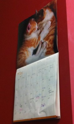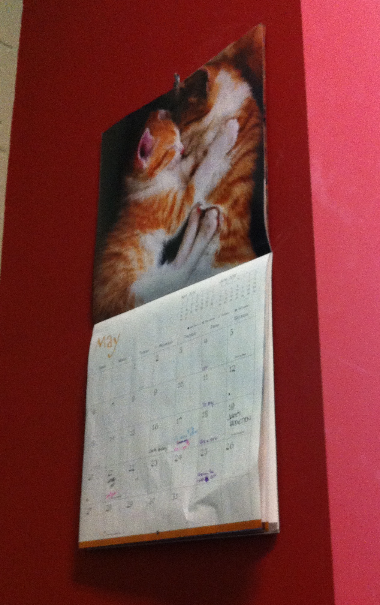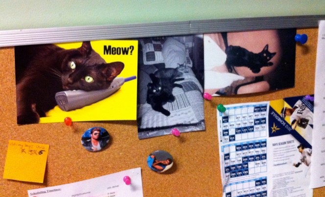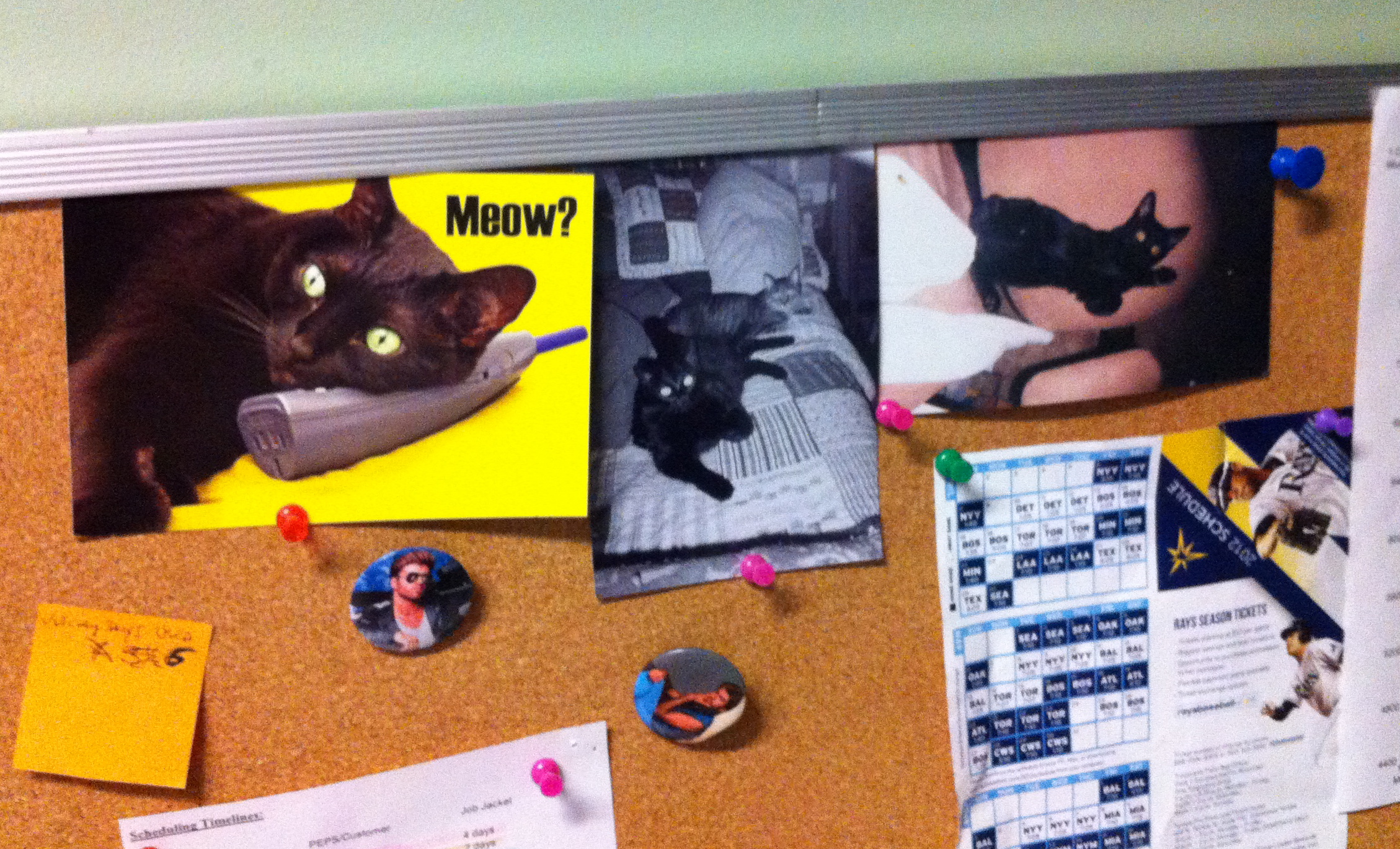 Next up. My bulletin board. Here we have a funny cat postcard. Next to that, a picture of Fatty and Little, and then a picture of my dearly beloved Jager who is no longer with us. I don’t have Taco and Moosh pics up, I see them enough. Look closely and you’ll see some George Michael buttons. And a Rays schedule. Yay Rays!