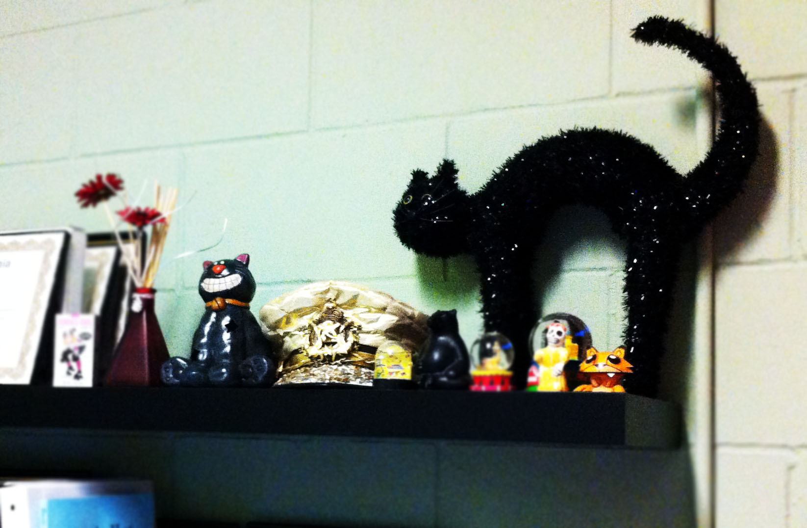 One of my shelves. Yes, I know you’re probably looking at the FABULOUS captain’s hat first, but focus. Weird grinning cat my mom gave me, a black cat from halloween my mother also gave me, and a Toy Robot cat my friend and fellow crazy cat lady Yvonne gave me.