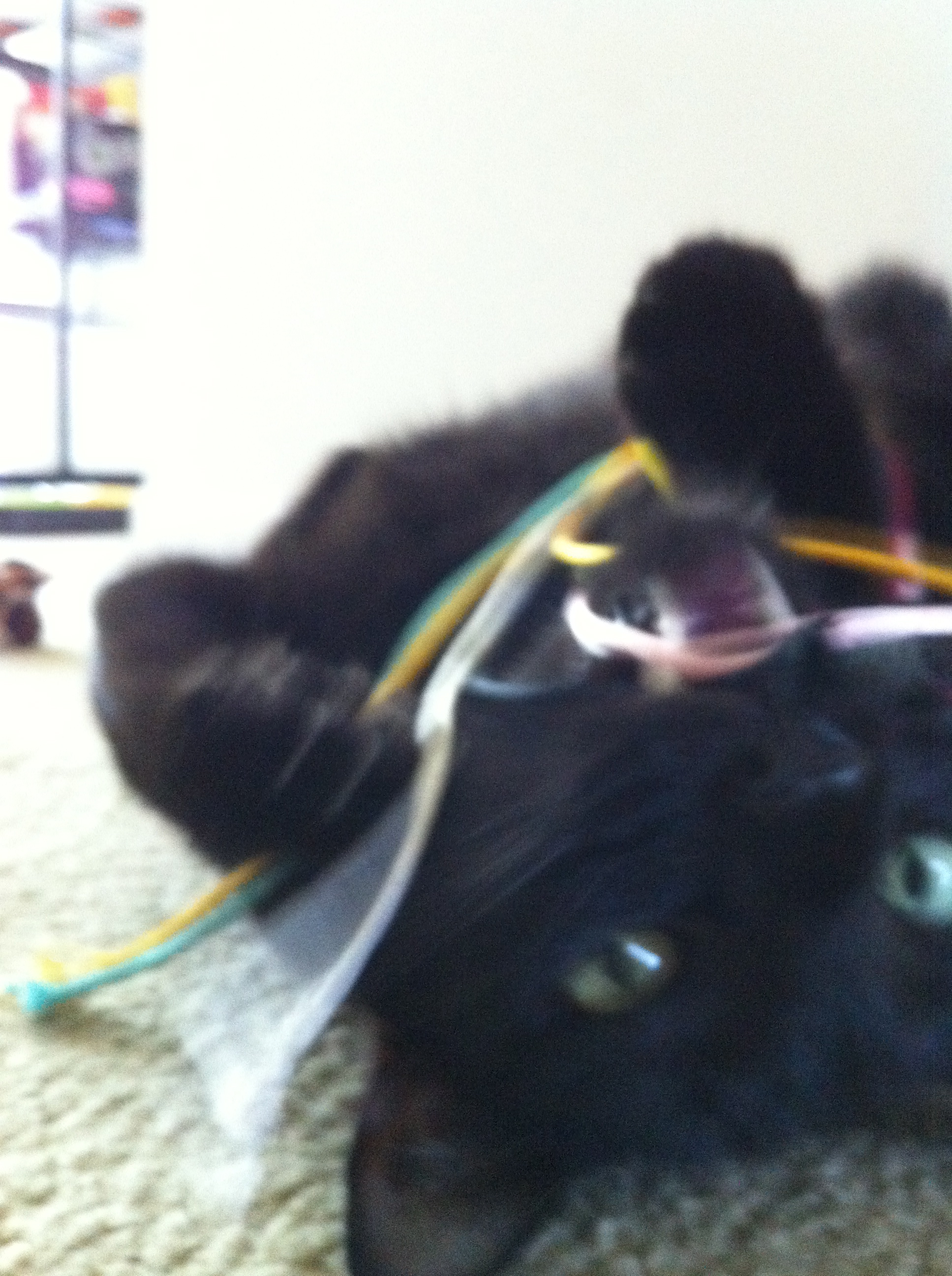 Jager ate my hair ties. He also would play with shoelaces, get his claws stuck in them, then frantically try to jerk them out, getting himself more tangled and more freaked out, then retreating to an area I couldn’t reach him making it impossible for me to help him.