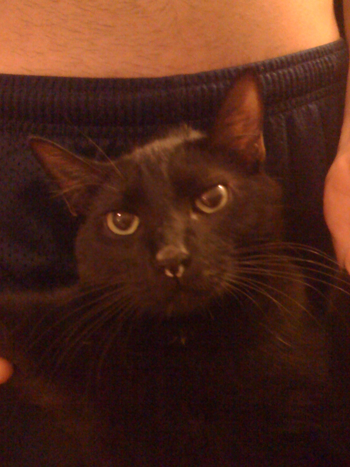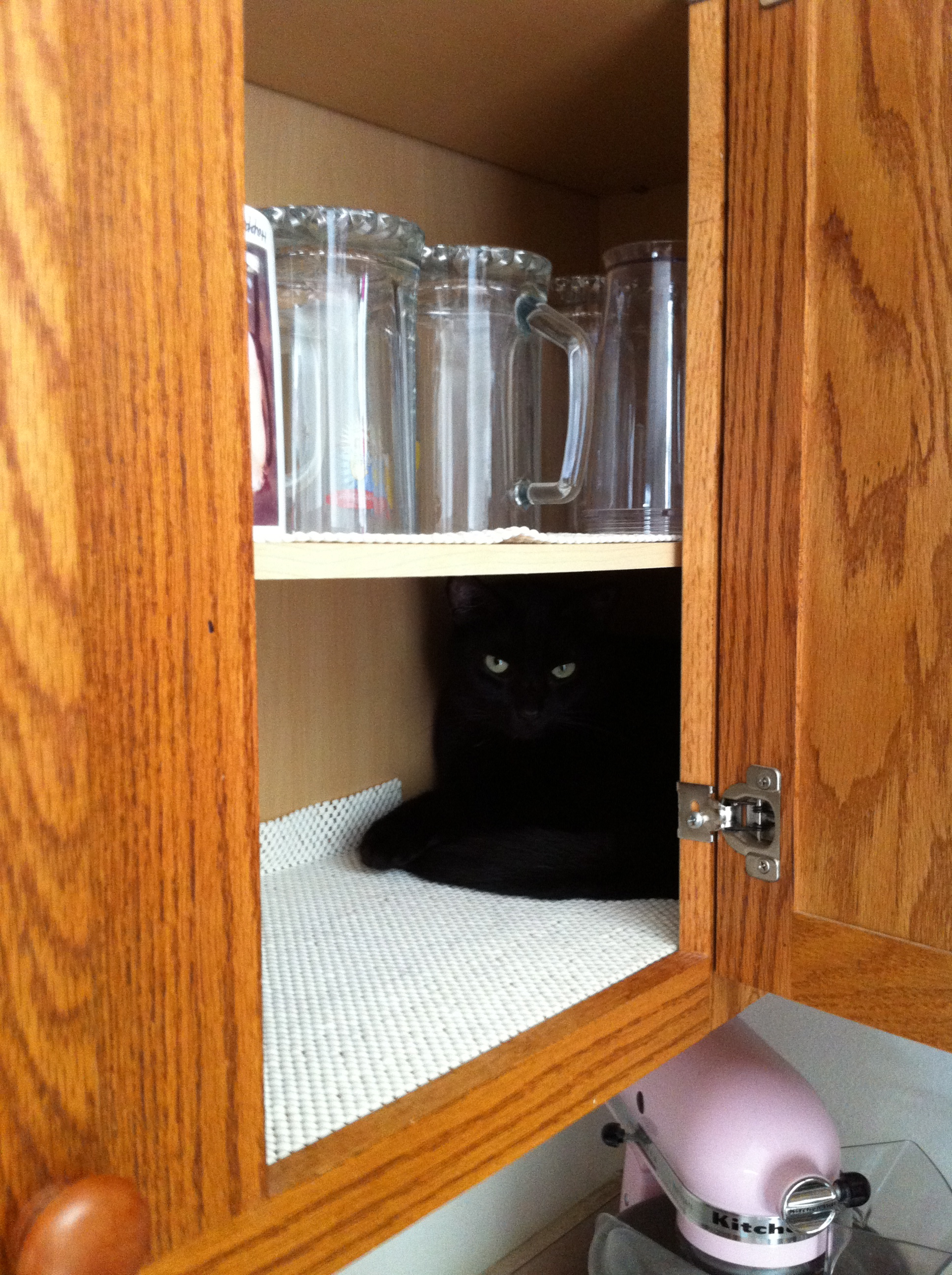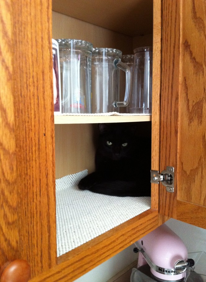 We were slightly alarmed to find him in there. You think your cabinets are safe and then…cat happens.