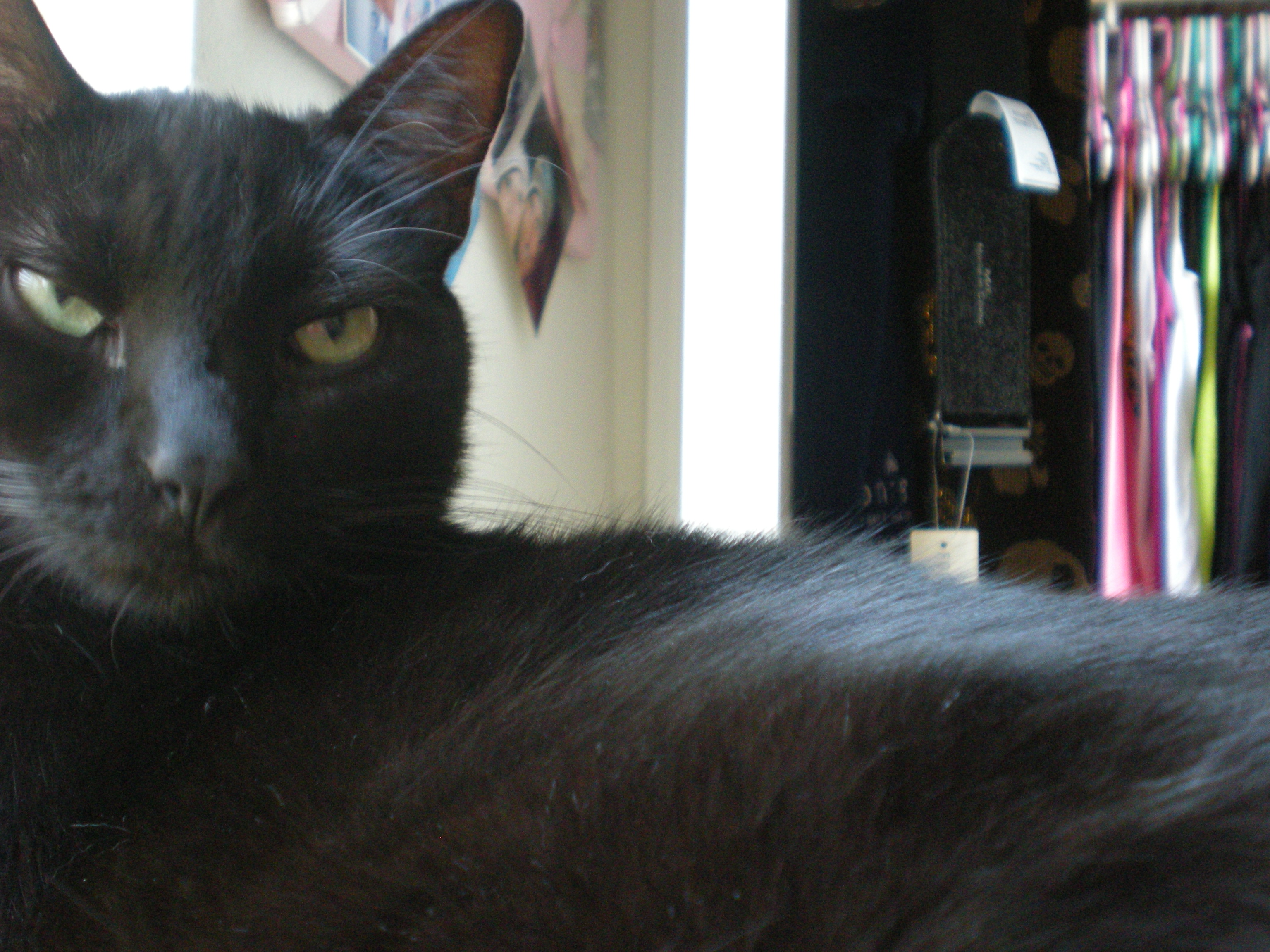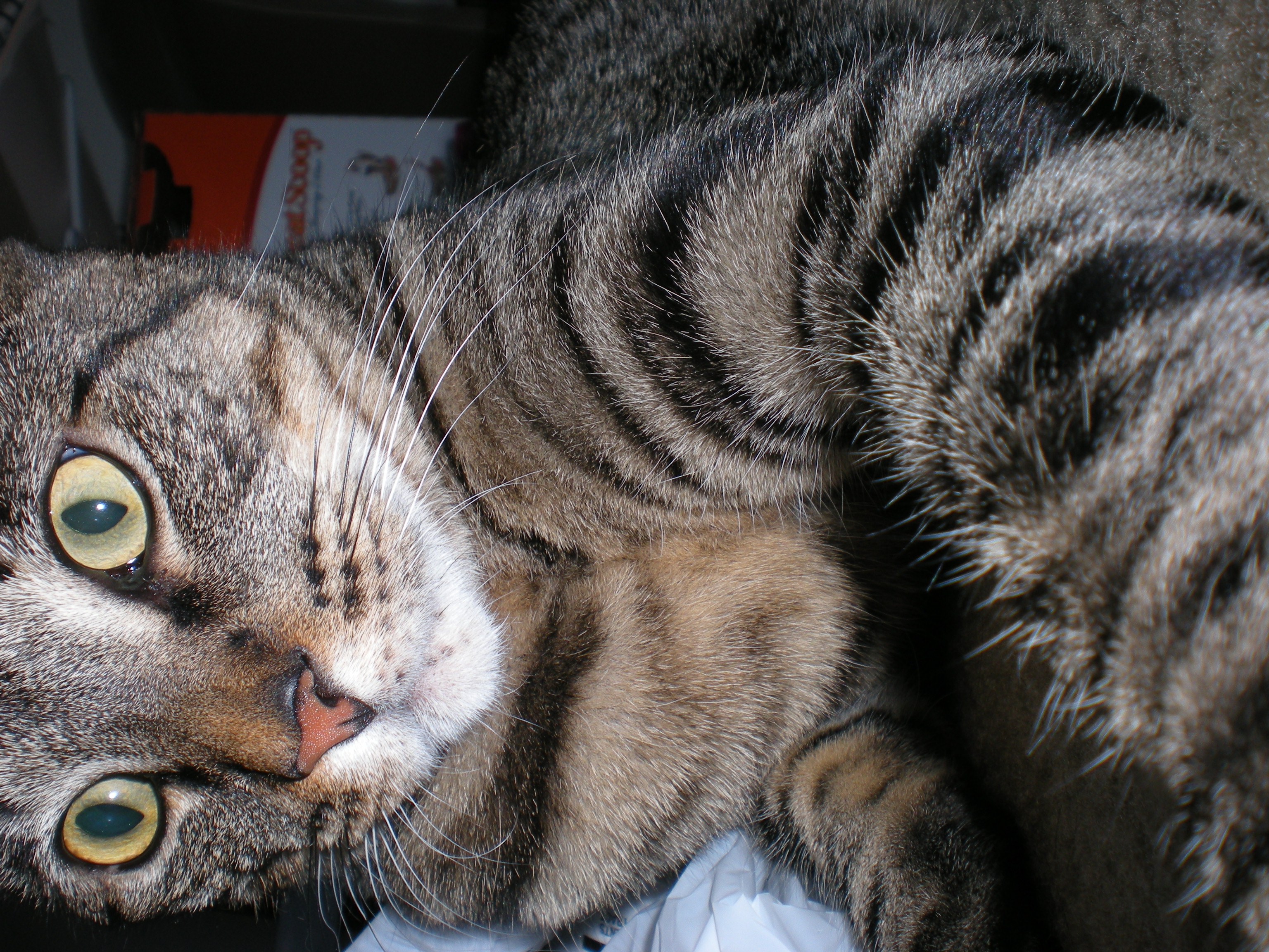 Hey now, our Petals has the same issues….eat’s too fast and then gets sick everywhere. As a renter, our landlord will be happy to know I’m shampooing the nasty carpet one spot at a time. We also bought the expensive Vet food $45 CDN per bag and nothing changed. The only thing that works is leaving very small amounts of nibblies at a time…funny enough, Petals practically lives on Wiska’s treats…green bag…I throw them down the stairs so she doesn’t just sit & eat too fast. Good luck with Taco. PS, that last pic of Moosh & the cattitude look is so darn familiar..LOL