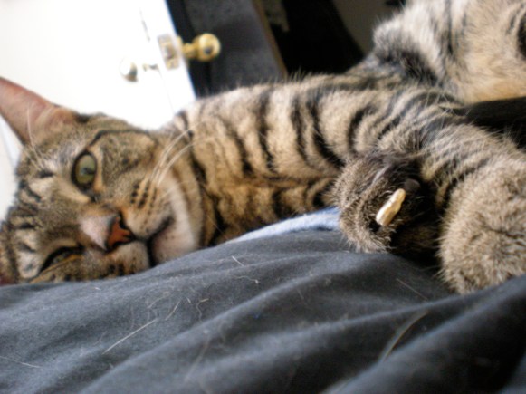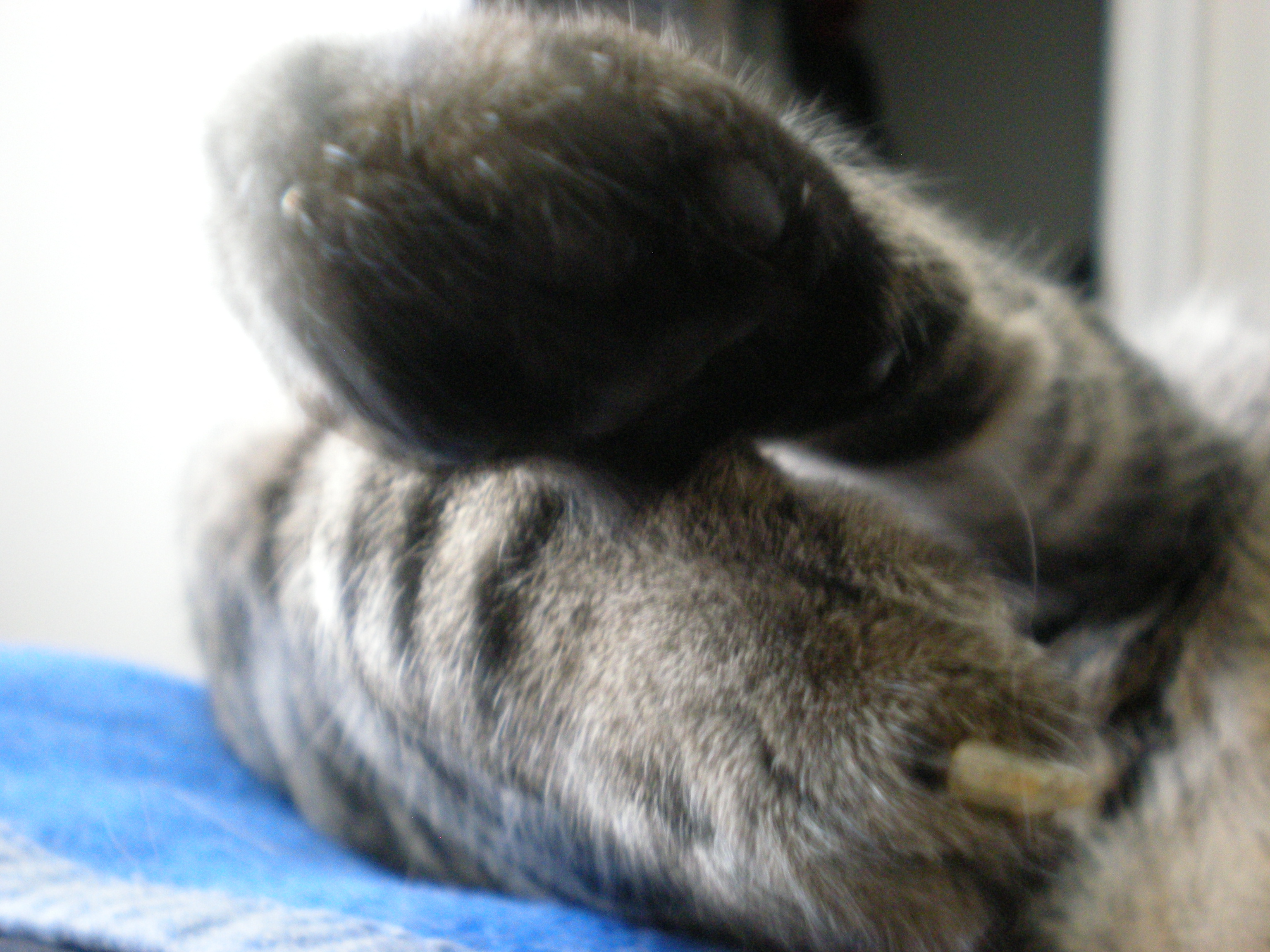 I couldn’t help myself, Taco was being adorably sleepy yesterday…so I took something like a bazillion pics. I’ve never really fancied myself a photographer (I DO, however, consider myself an artist, but I prefer sketching and crafting) so my little low-grade point-and-click camera has always sufficed. So now that I am trying to get all crazy getting good blog pics, I realize it is much tougher than it seems to take a good picture. Of course, this could be because I don’t have a $500 Nikon (they have one of those in pink! Not a good reason, I know, but I am a sucker for product presentation – I’ve been a Mac girl since I was a kid compliments of my dad’s preference and I fell in love with Apple all over again when they really started pushing the pretty product envelope…so excited about the new iPhone! And although I need a laptop and I know I could buy a perfectly good PC one for a fraction of the price of an Apple…I refuse. So I keep putting the laptop in my cart and then chickening out. I suck at saving, but I’m terrified of big purchases even though I end up spending just as much on a bunch of little ones. I’m pretty sure impulse buying is an addiction, and I need an intervention. Wow. Totally off topic here.) so maybe I just have to take a crapload of pics to get a good one. I prefer thinking that over the option that I am a bad photographer, I’m good at everything I do. And if I’m not, I don’t do it.