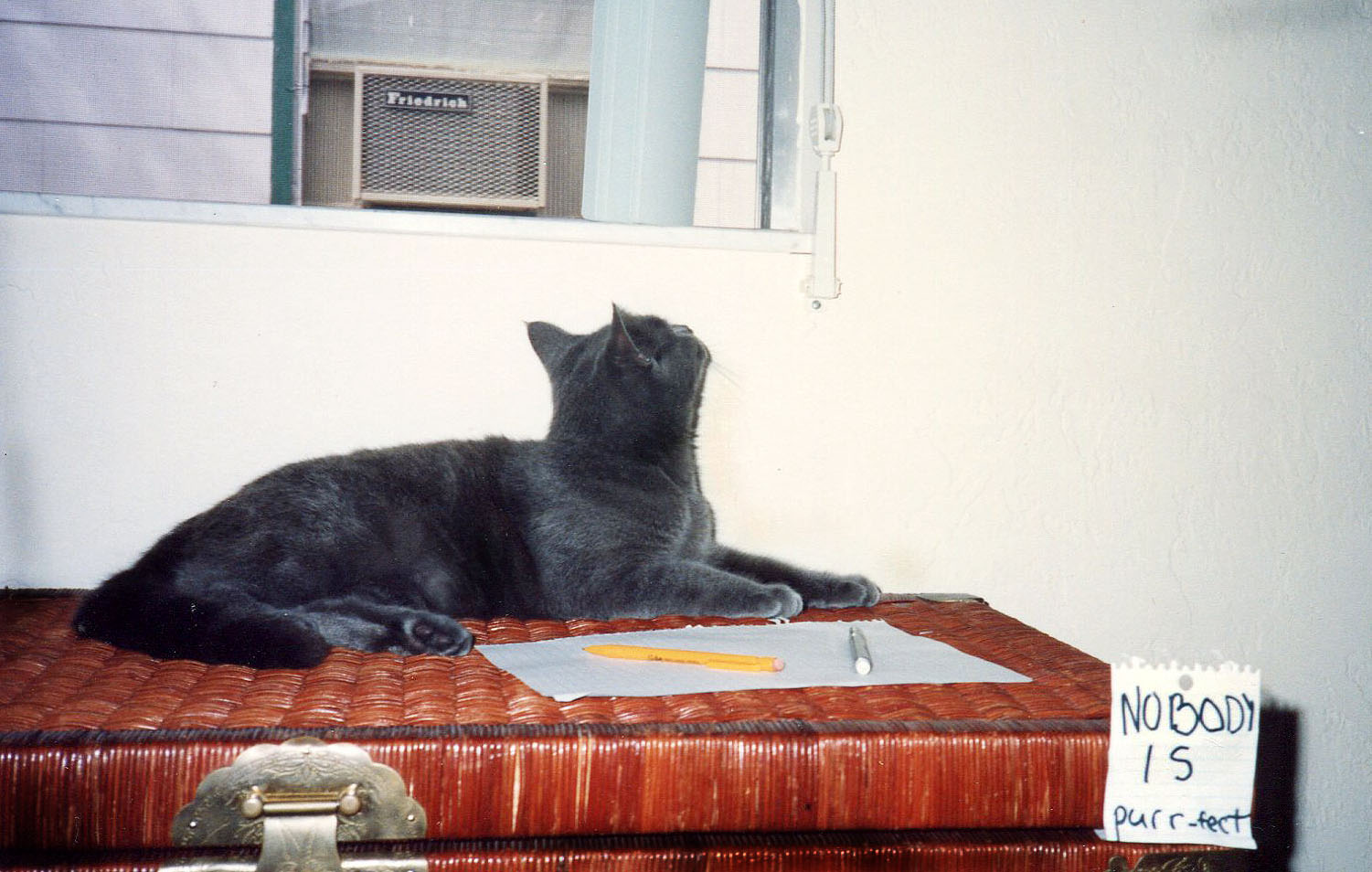 At some point here, we got his brother Sammy, too, but he was always outdoor and really skittish. He never really let us in but we tried to love him anyway. Until one day he disappeared and it turned out that my REALLY AWESOME neighbor had set cat traps because she did not like cats in her yard. I have never forgiven this horrible bitch woman because as a single mom, my mom didn’t have the money to get Sammy out of the pound. I hope in my heart of hearts that someone adopted him.