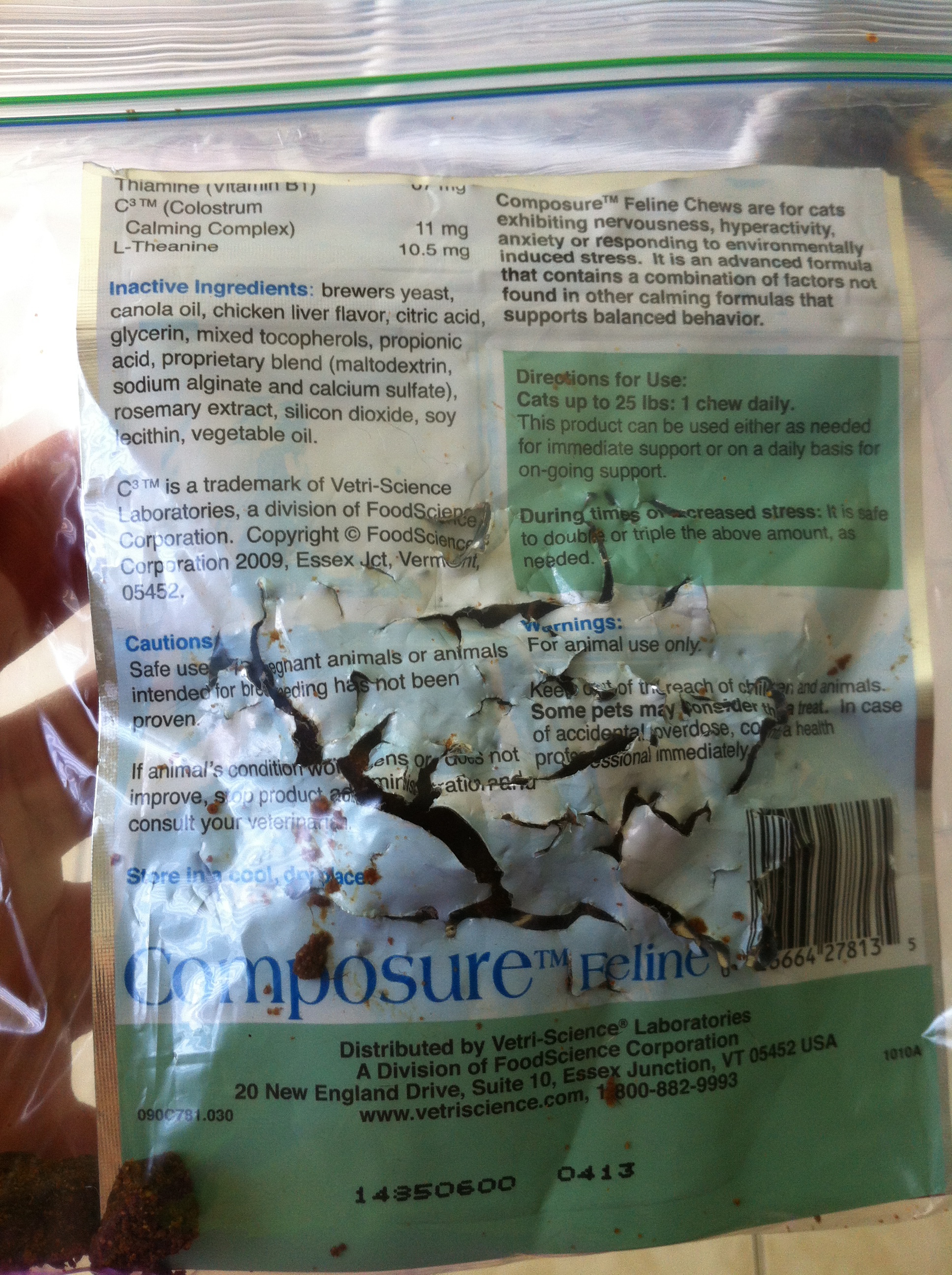 The bag of calming treats I accidentally left out. Had to call the vet, he's only supposed to have 3 a day.