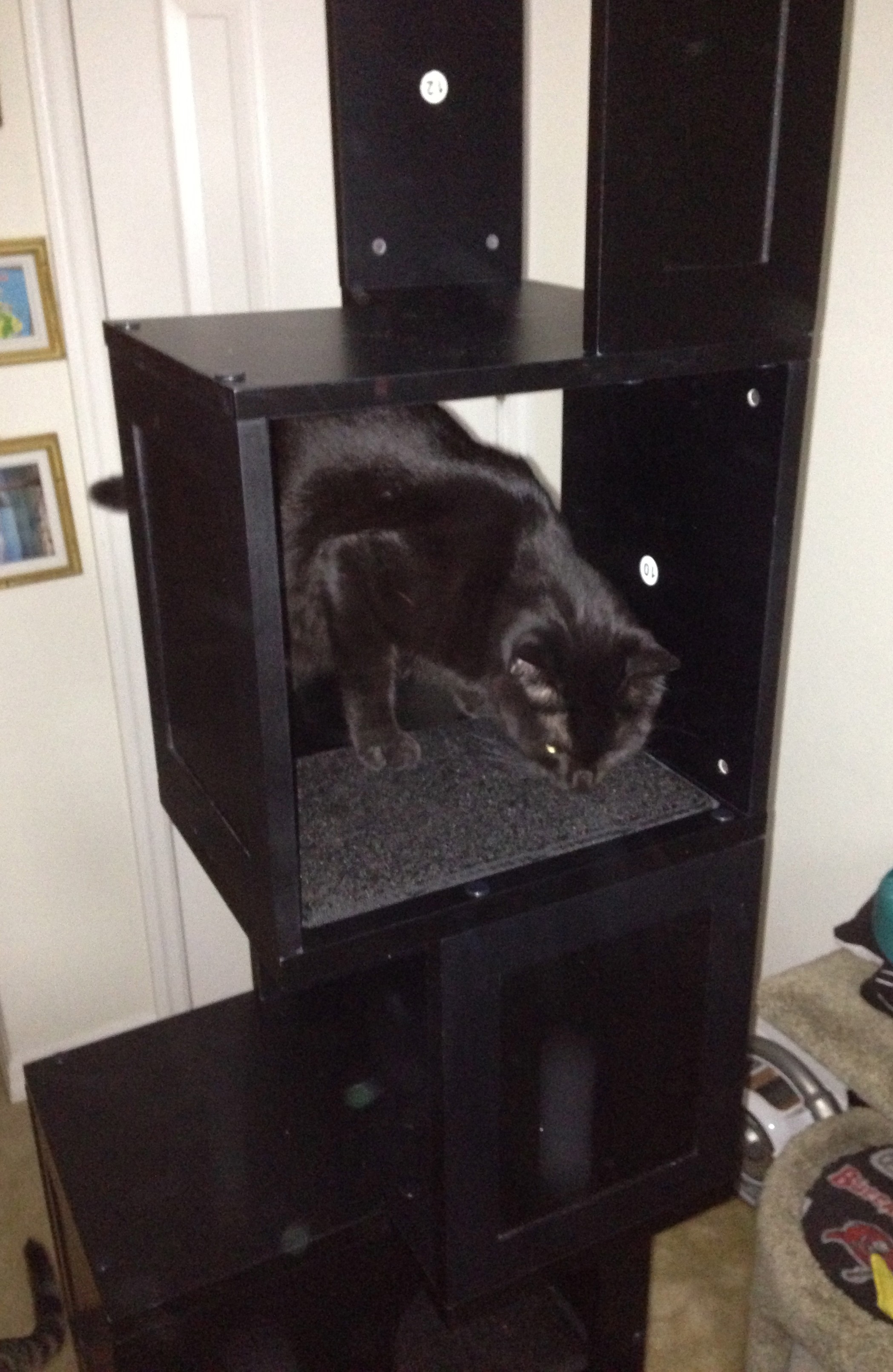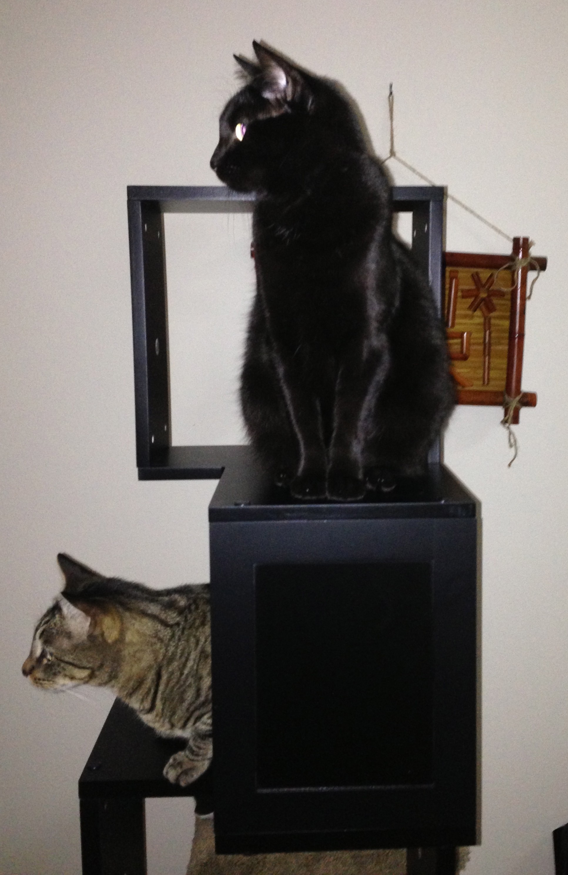 Aside from me feeling like someone stuck knives in my throat, I did take some pics of the kitties with their tree last night while I wasn’t aware of the sickness yet. The boyfriend did a lovely job of putting it together without breaking anything. They seem to vaguely enjoy it. Now if we could just agree where to put it.