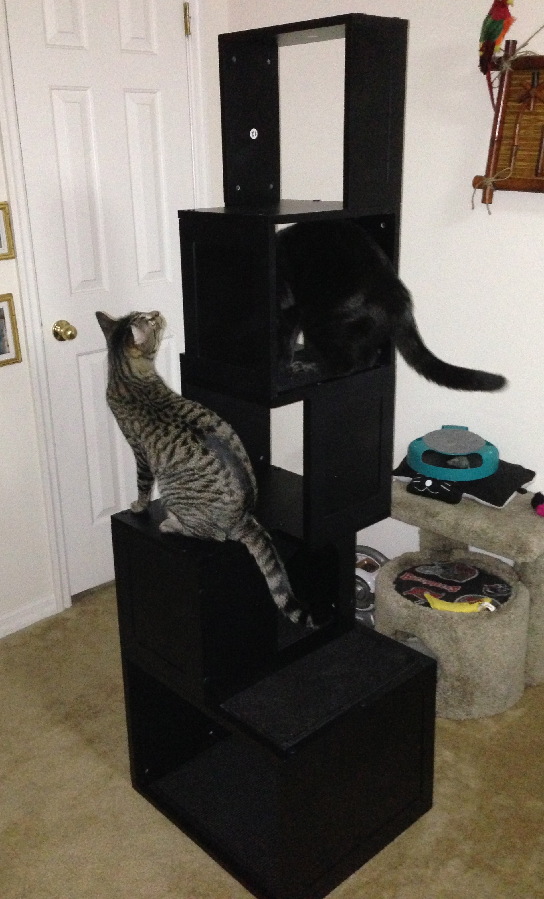 The boys enjoying the lower levels. Much to my dismay, though, neither has utilized the bottom level’s sisal. Hmph.