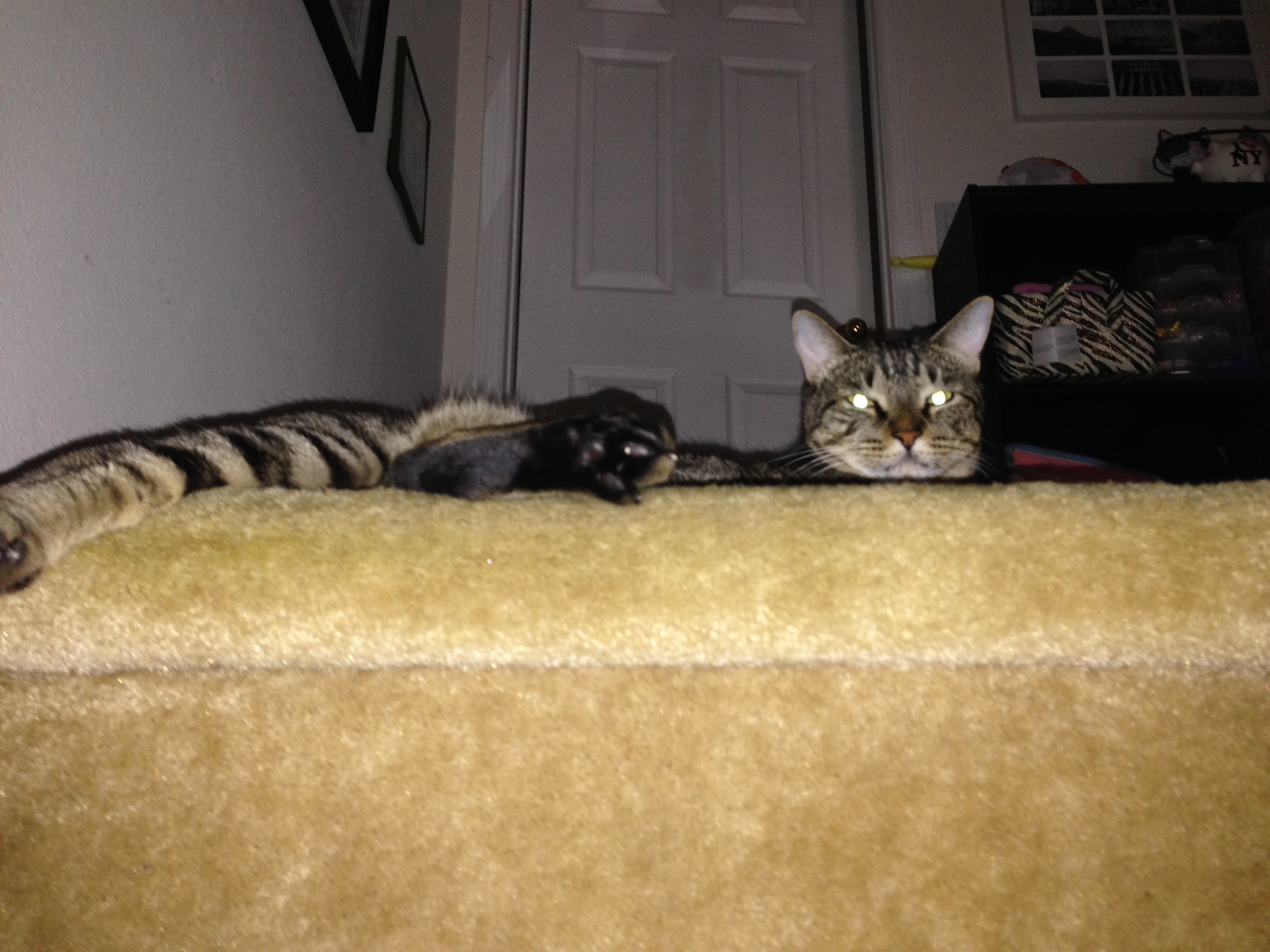 Furthermore, no stranger has ever done anything to my cats for them to have emotional damage from (well, Moosh maybe, but oddly enough, he’s the more friendly of the two). Since all humans have EVER done to them is feed them and love them, WHY DO THEY ACT LIKE ANYONE NEW IS GOING TO KILL THEM?