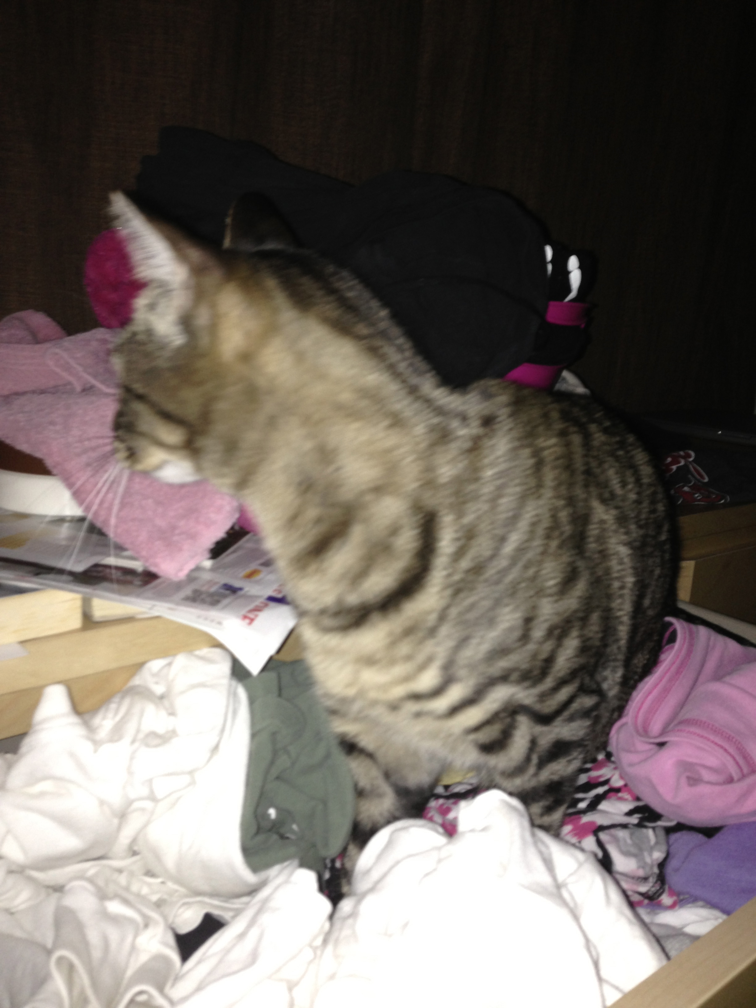 No. Because then the scratching started. Being half asleep, I thought Taco was scratching to open it again. But he wasn’t there. So I opened it. Apparently, the little shit thought it would be a hoot to BURROW in my clothes and sleep there. Why this was a good idea, I’ll never know. I tried to get a picture but he moved too fast, once he decided to pop his head out and emerge.