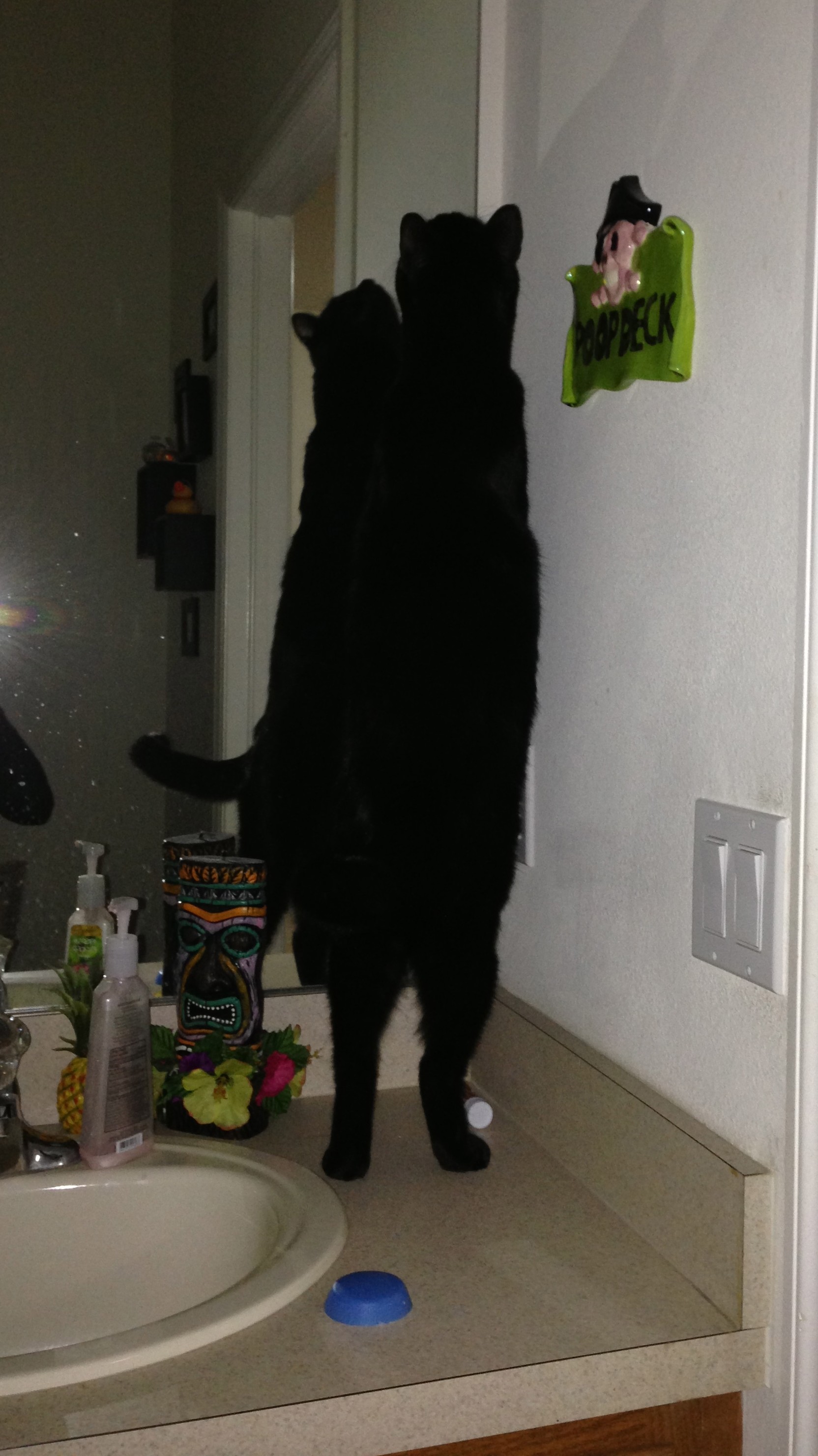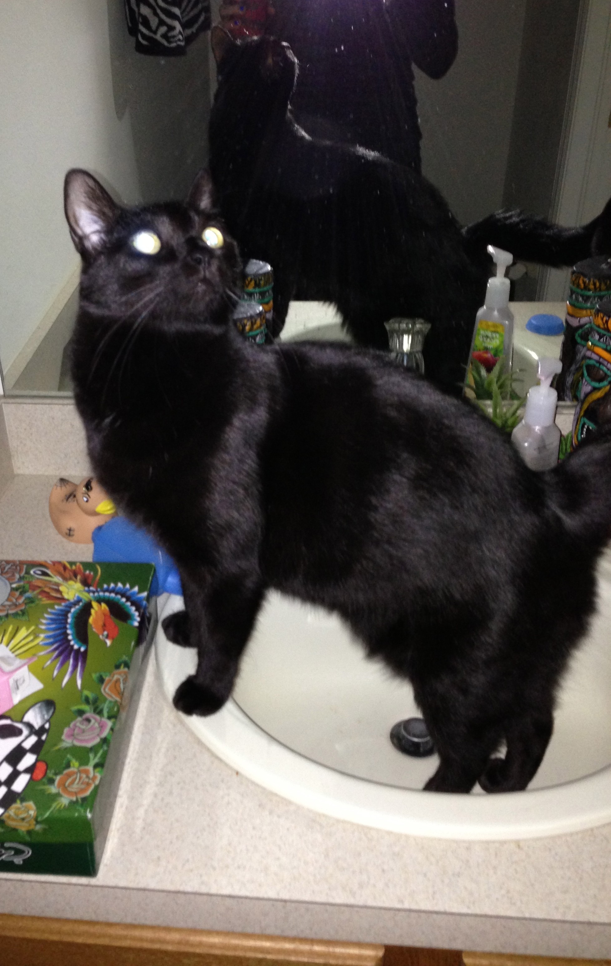 So this new thing with Moosh. I realized it had become a permanent trend last night as I was in the downstairs bathroom doing my business, and I see a paw snake through the crack of the door, a black blur runs in and immediately jumps onto the counter. I sat there taking pictures (after I finished my business, of course, sorry for the mental picture, unless you like that sort of thing, in which case please stop reading my blog, you’re a weirdo) as he explored the countertop chock full of magical wonders. Like a sink. WTF.