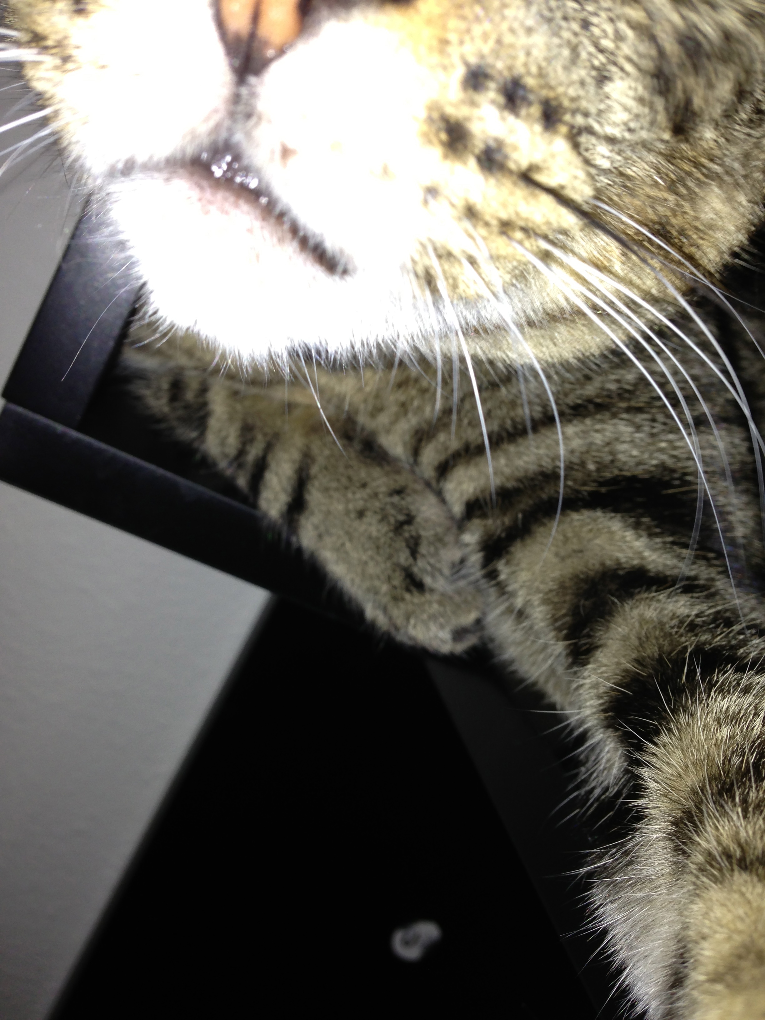 But enough about me, this is about the cats. Moosh is looking pretty hefty these days. I know he’s not as active as Taco, which is fine, but he’s also the one who gets pushed out of his own food because Captain Stuffmyface already finished his and wants to hijack his brother’s. Which, in turn, leaves me with a very whiny kitty half an hour later when Moosh discovers that he has not, in fact, had enough to eat. So then I have to feed him again, and try to keep Taco away. Taco, despite eating two helpings, gained exactly one ounce in the year between vet visits. Go figure.