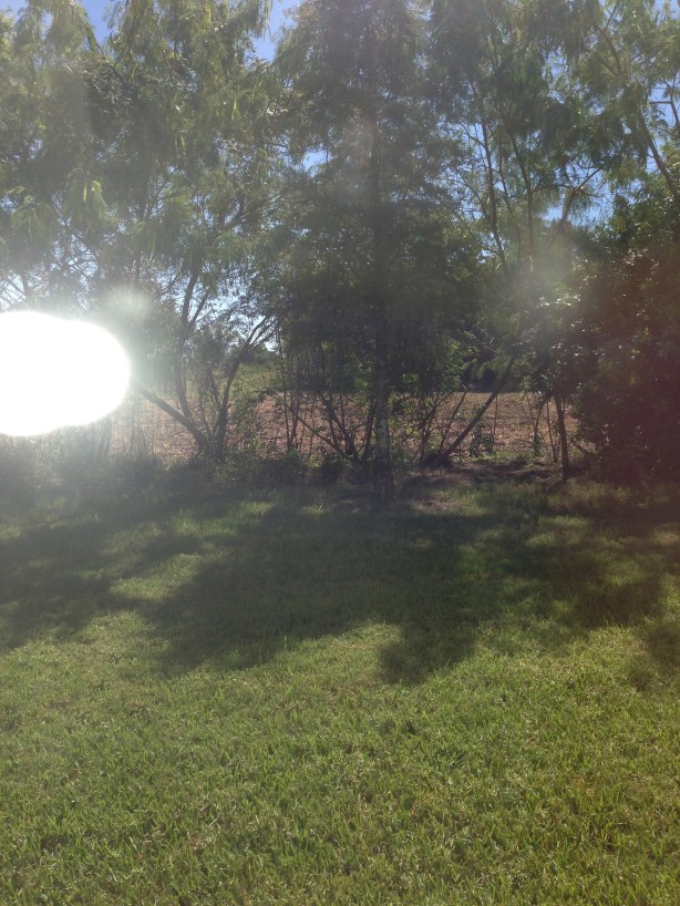 I live in a townhouse. Behind my townhouse is a “yard,” then some trees and foliage, and then what USED to be some sort of overgrown field. I’m not sure what was back there, I never ventured that far. I almost did one time when we thought Taco had gotten out (he was inside the couch) but nothing bad really ever seemed to come from back there either so I didn’t really pay it any mind. There are bunnies who come out and eat the grass and amuse the kitties by ignoring them completely. I had imagined they lived in the growth back behind the trees.