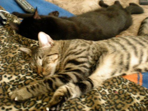 Jackson also says that cats are either tree dwellers or bush dwellers. Moosh is definitely a tree dweller, he wants to be on top of everything. I found him in my cabinet once. Next to the clean glasses. Taco has no interest in jumping on much unless there’s something for him to mess with. He can, however, jump chest high. I wish I had a better camera that was capable of catching him in a leap, because it’s really a sight to see. I assume that’s the Bengal in him. I don’t know what any of this means in terms of making my cats behave better, though.
