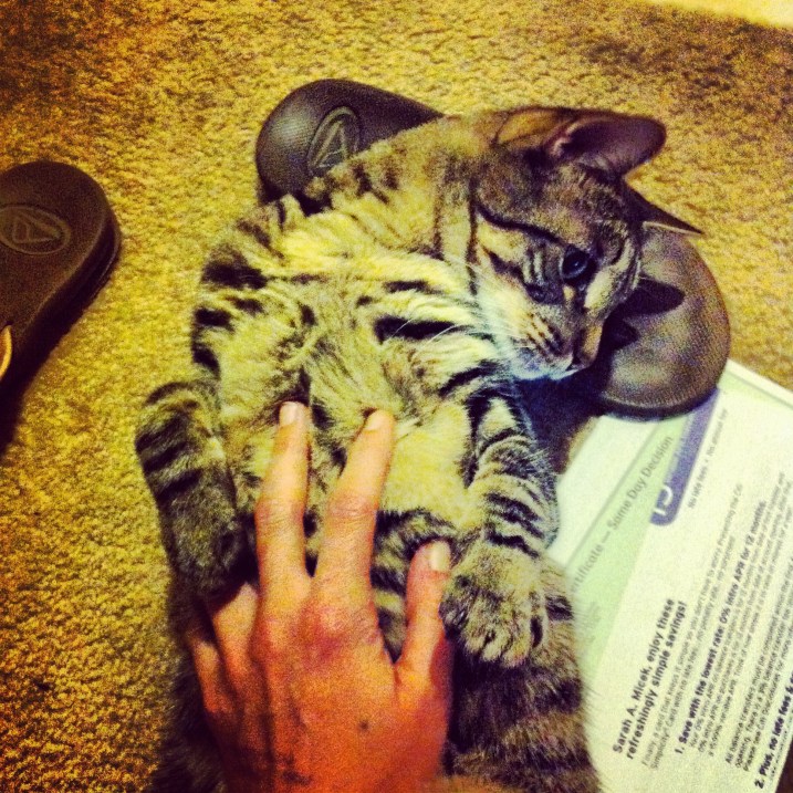 - He fucks with everything. He’ll be sleeping on my lap peacefully and out of the corner of his half-closed eye see a non-moving pen on the desk…and stick his fat paw out to grab it. He somehow managed to find a old bottle of diet pills in my closet, opened it, and tried to eat one, resulting in an epic freakout on my part (it turned out he didn’t eat one, but it was a frantic 15 minutes figuring that out).