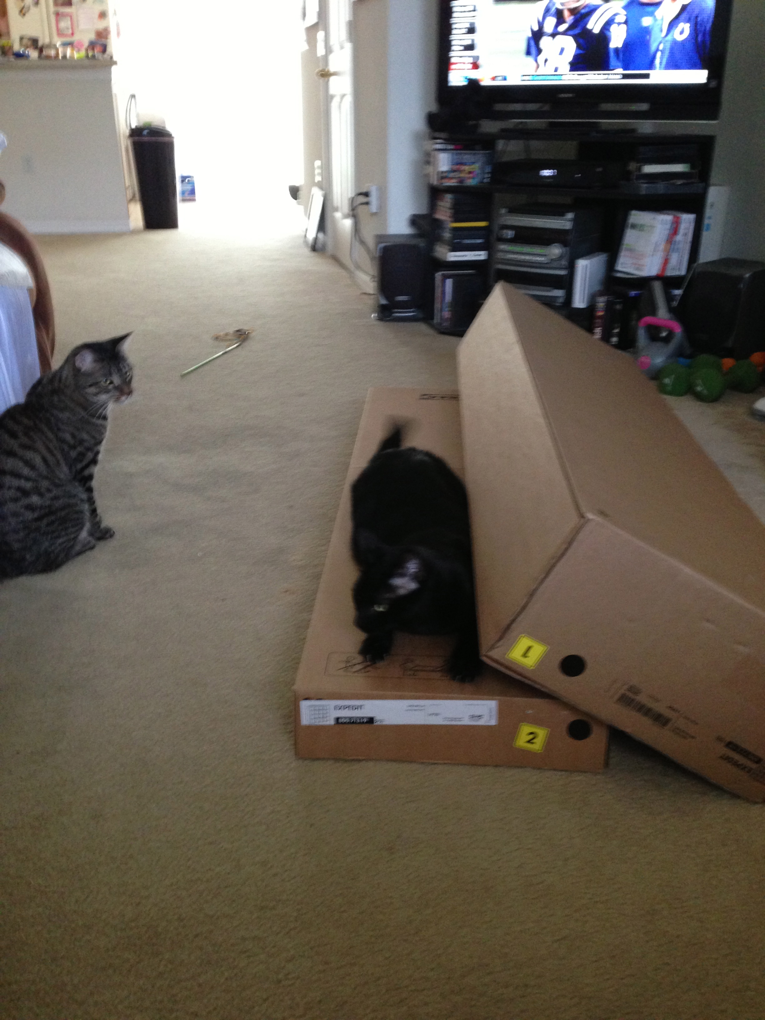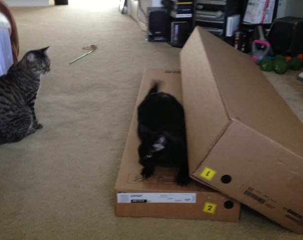 I cannot fathom why. They both spend the majority of their time sleeping upstairs. Moosh’s current favorite place is in my closet, and Taco’s is under or on the bed. They have developed relationships with the boxes they’re already used to. Why is this new box so special?