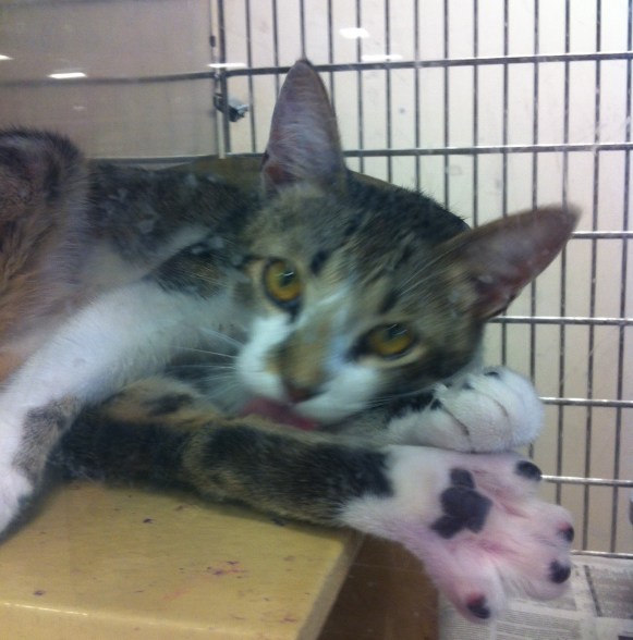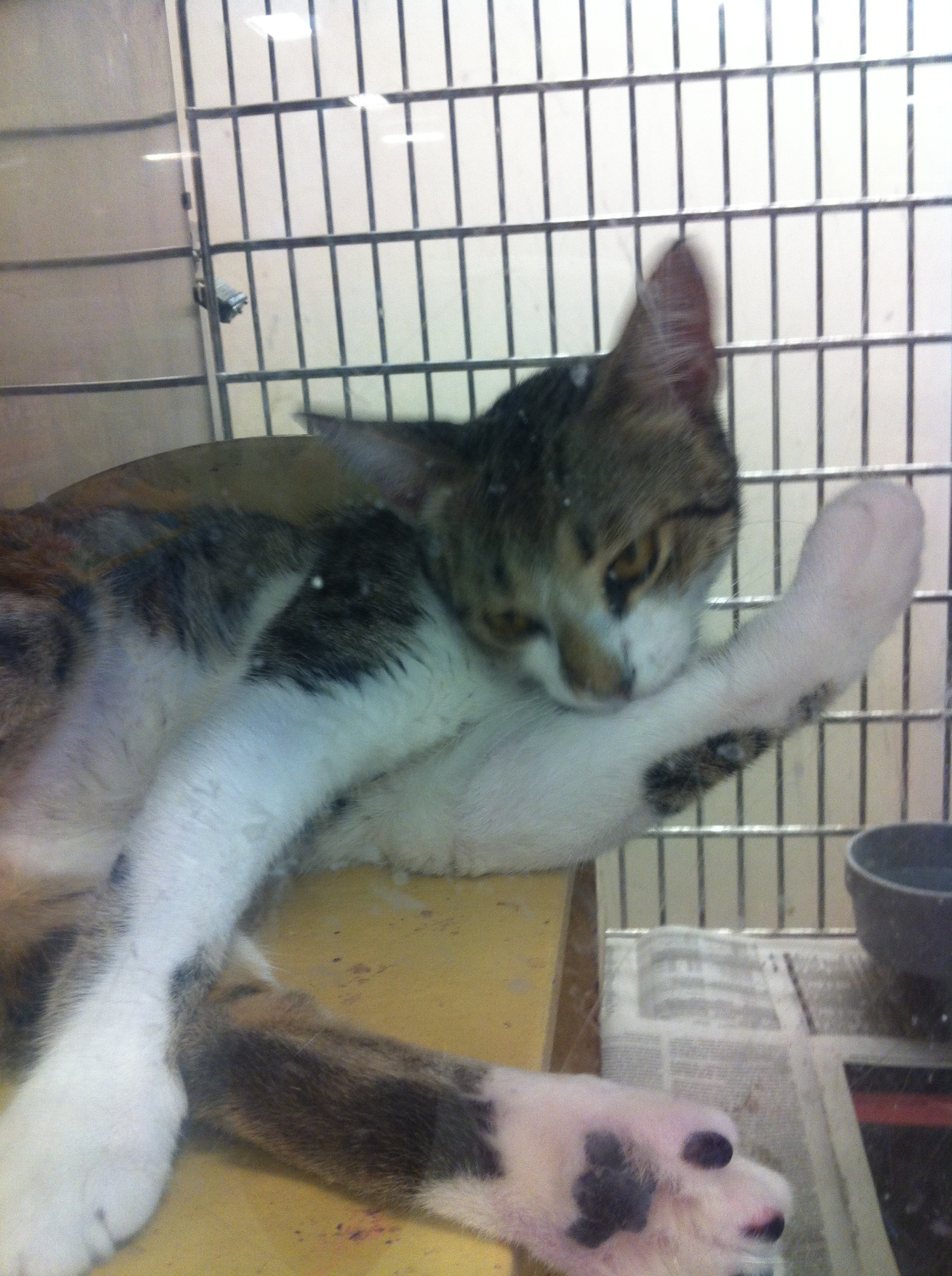 But every time I see adoptable cats, I want them. They are calling to me. I was at PetSmart today (I only shop there because I can get Taco’s prescription food there, which they SO INCONVENIENTLY put next to the adoptable cats) and these kitties were CALLING to me. One literally was, I told him I couldn’t have another mouth in the house. Taco is deafening enough. But there is always one that really really gets me. This time, it was a 10-month-old tabby/white mix. I generally don’t even like partly white cats (I like them all, I just usually don’t find them attractive). This big guy was so cute. I am a sucker for big paws, and he stretched those big mitts out at me, just BREAKING my heart.