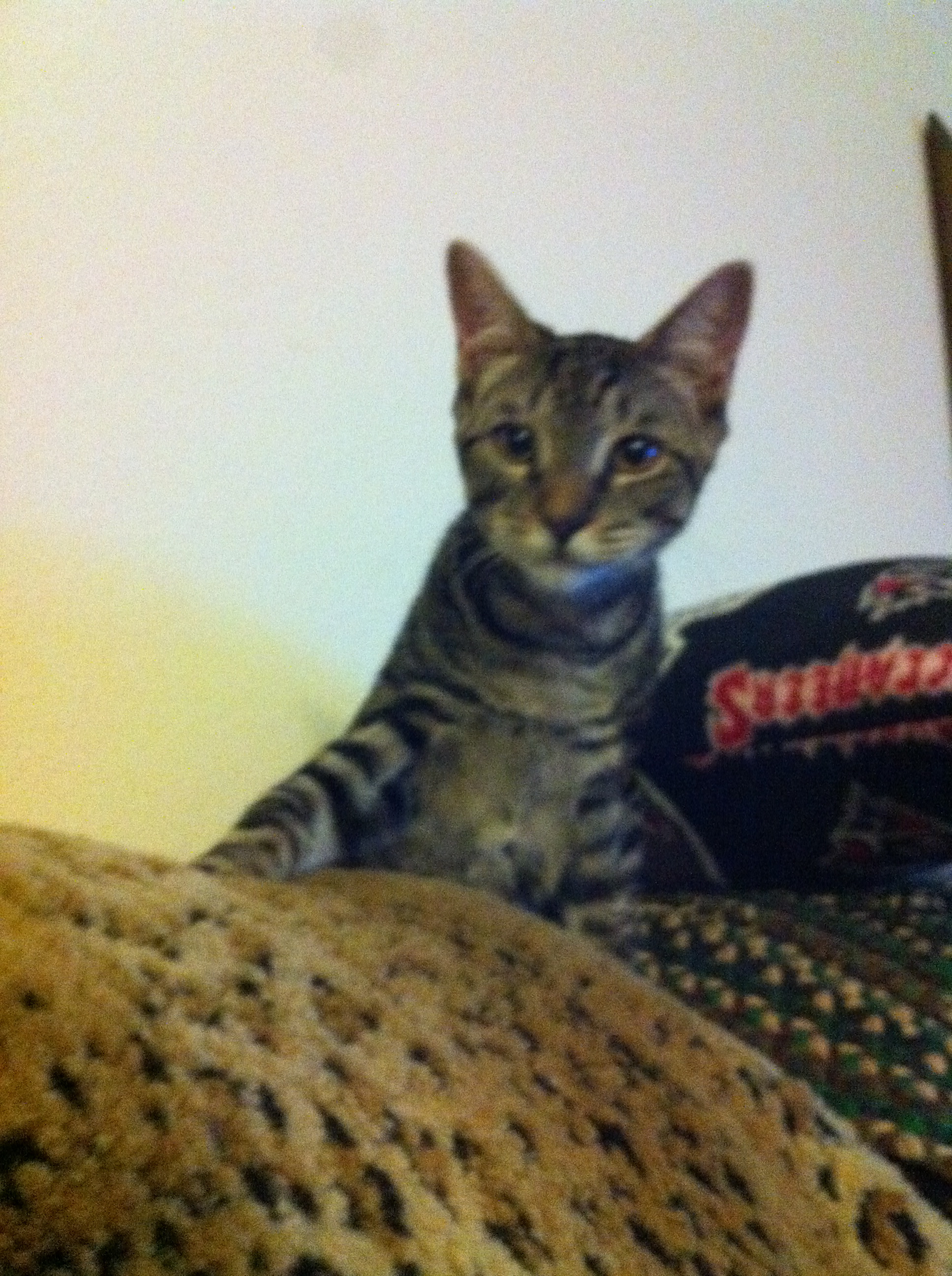 First, he was kinda cross-eyed when he was younger. We really didn’t think he could see up close at all. It seems to have straightened out a bit but sometimes I still don’t think he can see up close. He also needed to try everything once. I found him climbing a wall. He singed his whiskers sniffing a candle. He’s never done either of these things again.