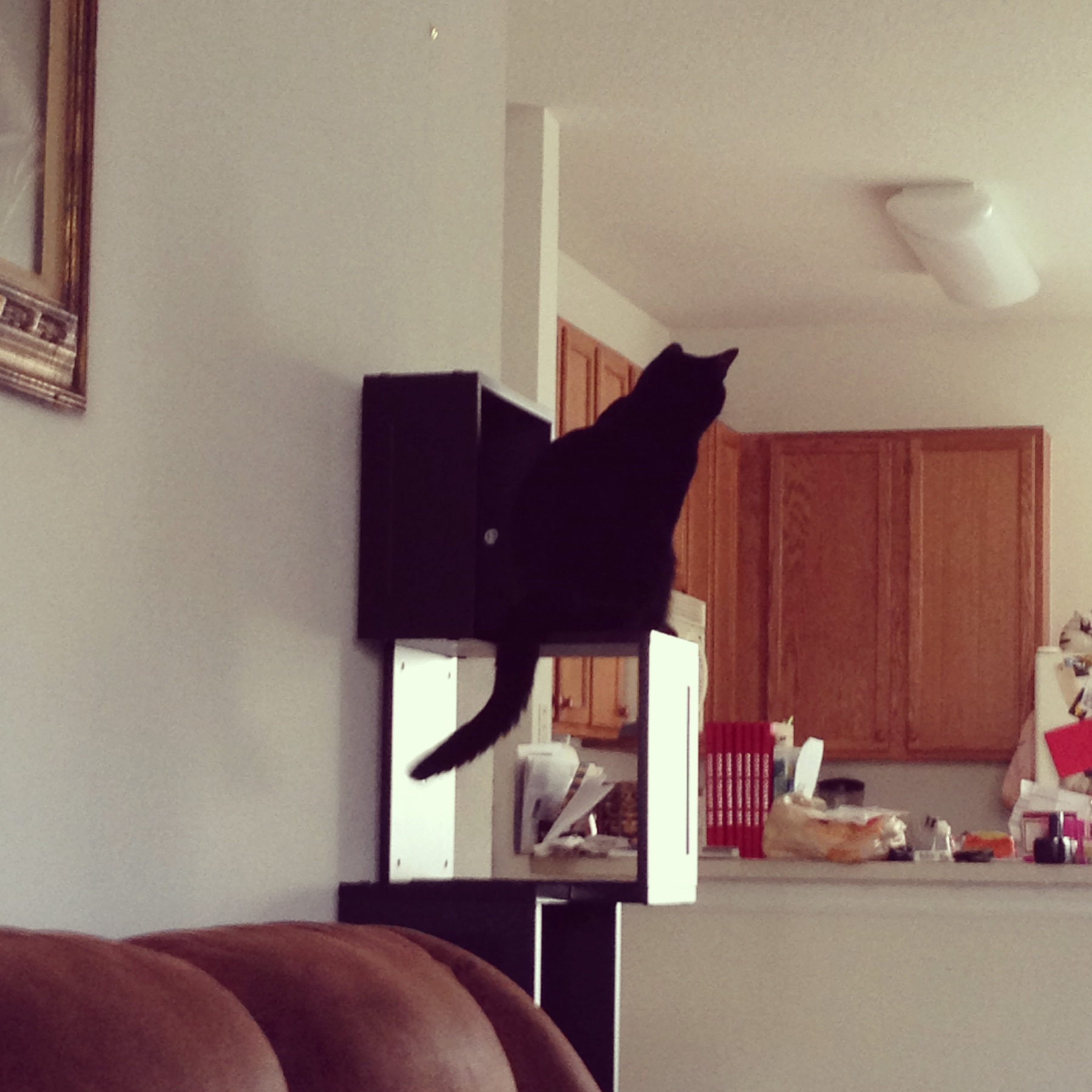Update: For no apparent reason today, I caught Moosh on top of the fridge today, where he hasn’t been seen in months, who then, upon being spotted, made a run across the cupboards, then back again to the fridge and then down the minute I sat up to attempt a picture. This is what the cat tree was supposed to solve. Sigh.