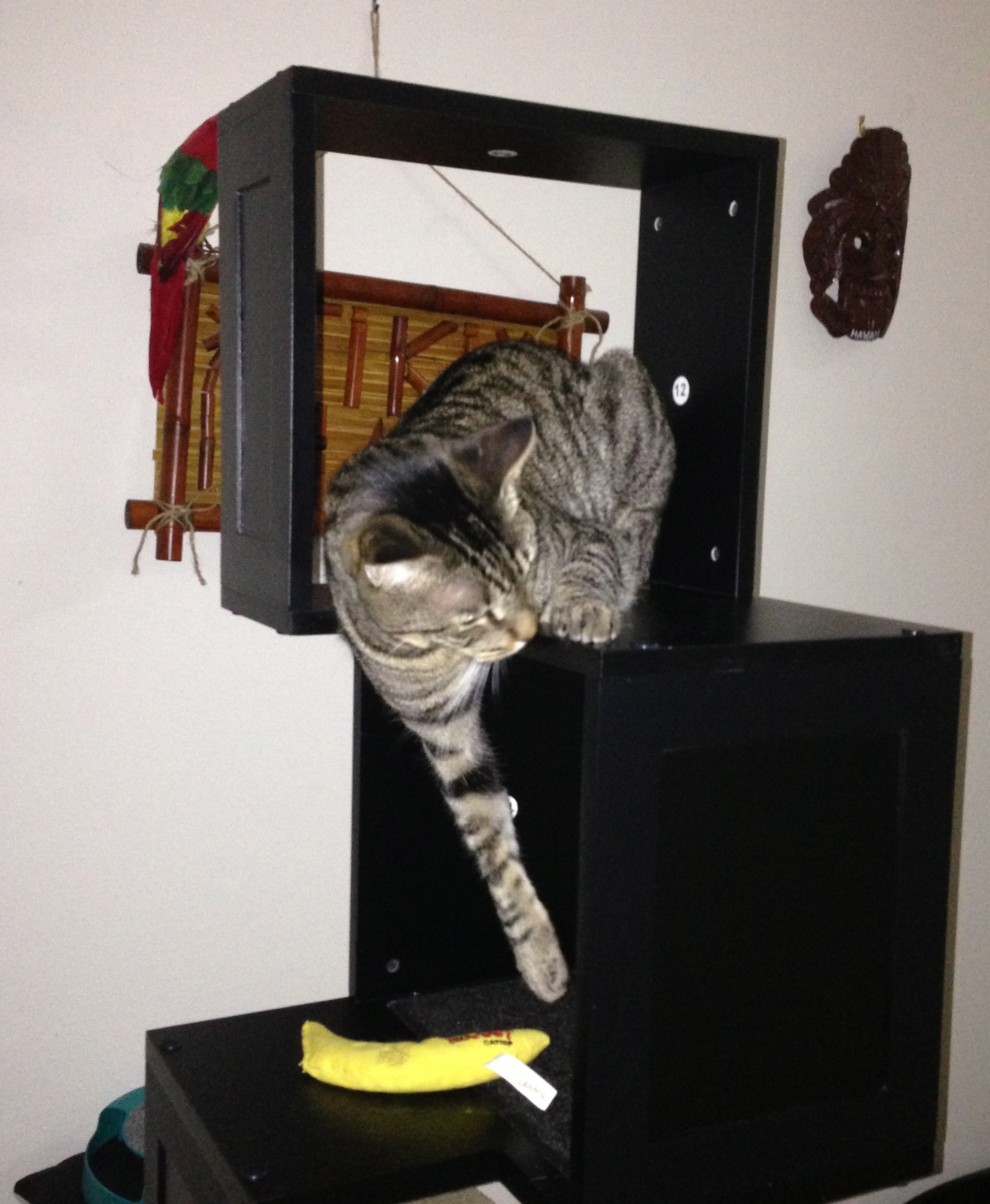 So long as I give him the foothold, he’ll stand up there with very little wobbling and no claws. Taco, on the other hand, is like a Weeble Wobble, but he’ll sure as hell fall down, and he’ll take my skin down with him.
