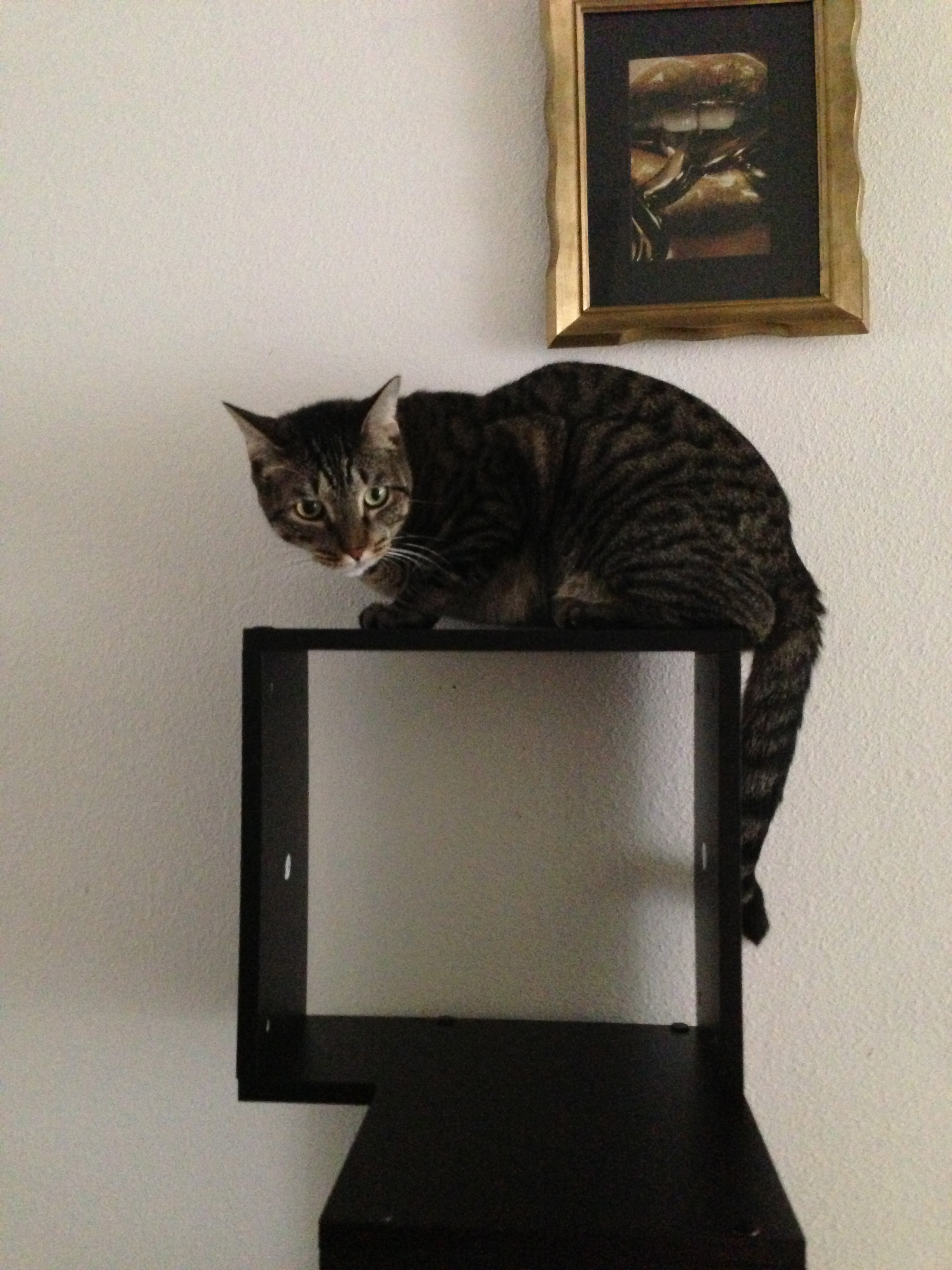 Update: For no apparent reason today, I caught Moosh on top of the fridge today, where he hasn’t been seen in months, who then, upon being spotted, made a run across the cupboards, then back again to the fridge and then down the minute I sat up to attempt a picture. This is what the cat tree was supposed to solve. Sigh.