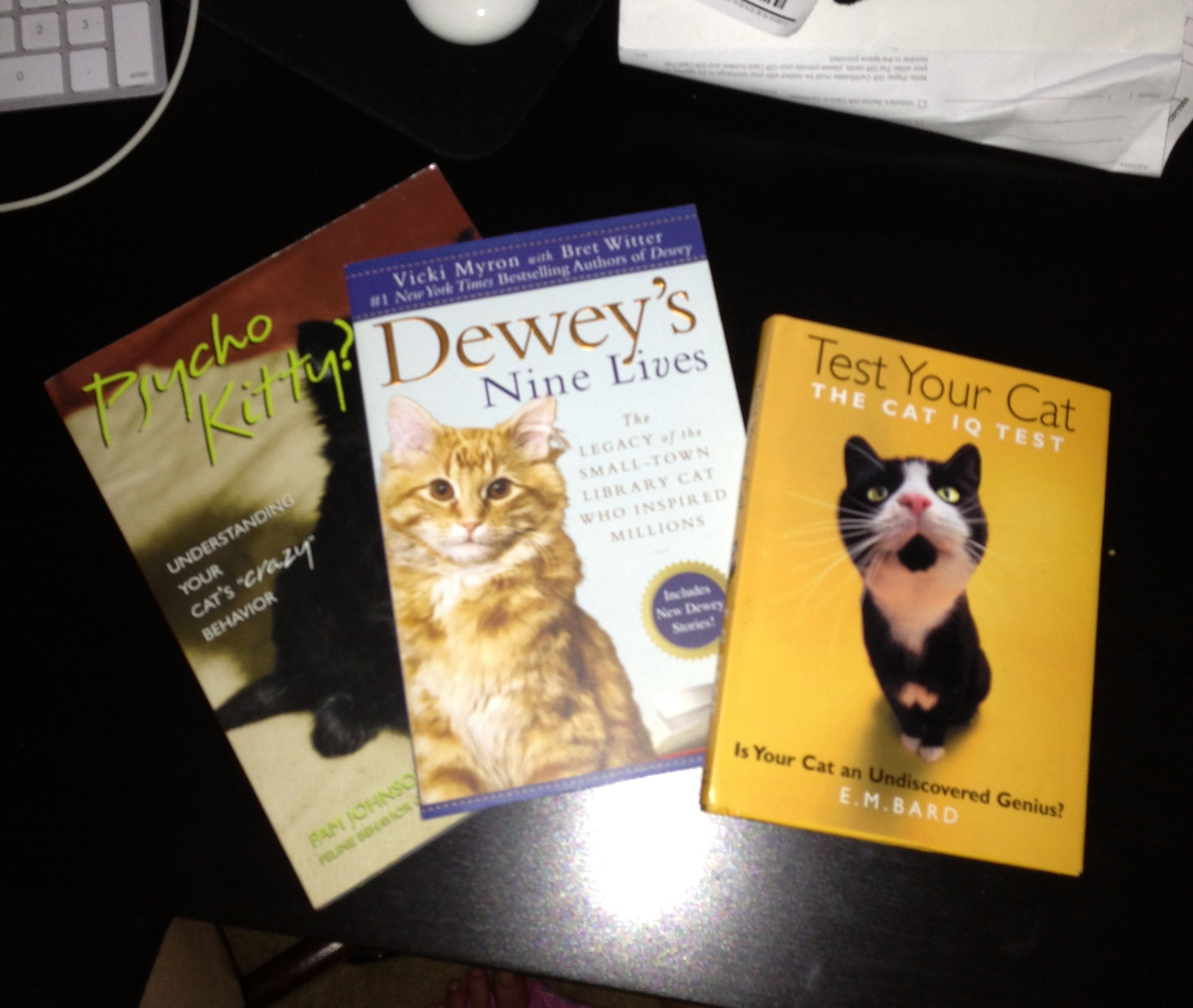Since I’m not doing anything fun, I decided to read. Yesterday I really needed light reading, so I read some chick lit, which turned out to be teen books, but I enjoyed anyway. Today, since my brain is a little less foggy, I’m turning to non-fiction. I decided to finally read ALL the books in my house that are about cats that I’ve been meaning to read.