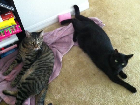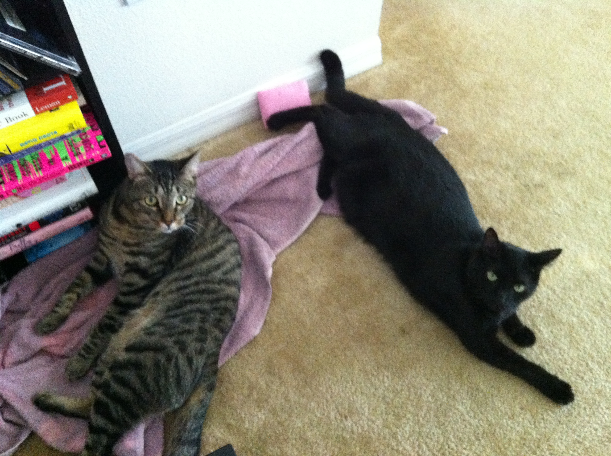 I will never understand why it takes Taco two full days to stop hissing at Moosh when he gets back from the vet. It’s not like his scent isn’t EVERYWHERE. Sometimes I think they’re really smart, and sometimes I agree with the boyfriend about them having pea brains.